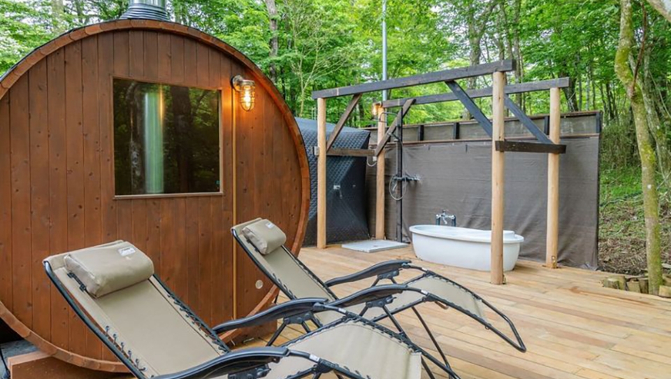 バレルサウナに専用のシャワー、水風呂、外気浴スペースがついた完全プライベートな空間です。
